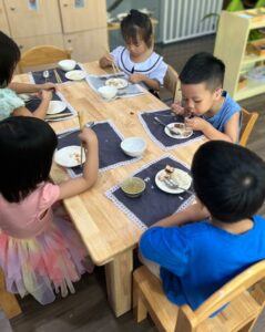 Dinh dưỡng tại FUJI Montessori Nha Trang được xây dựng theo tiêu chí lành mạnh, cân đối, phù hợp lứa tuổi. Thực đơn ưu tiên nguyên liệu tươi, sạch, chế biến đơn giản để giữ trọn giá trị dinh dưỡng. Các bữa ăn được tổ chức như một phần của hoạt động giáo dục: trẻ học cách tự phục vụ, ngồi ăn đúng cách và tôn trọng thực phẩm.