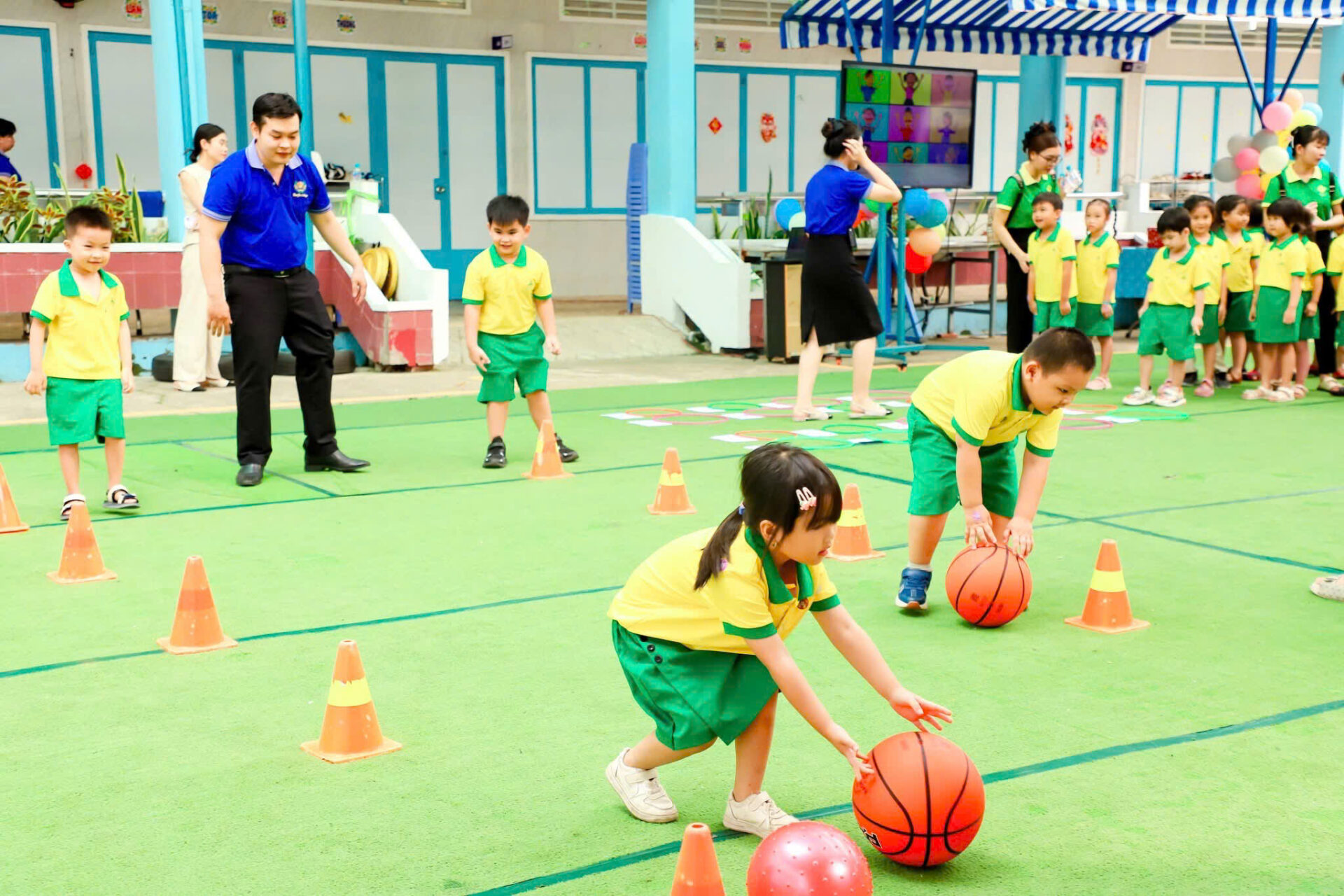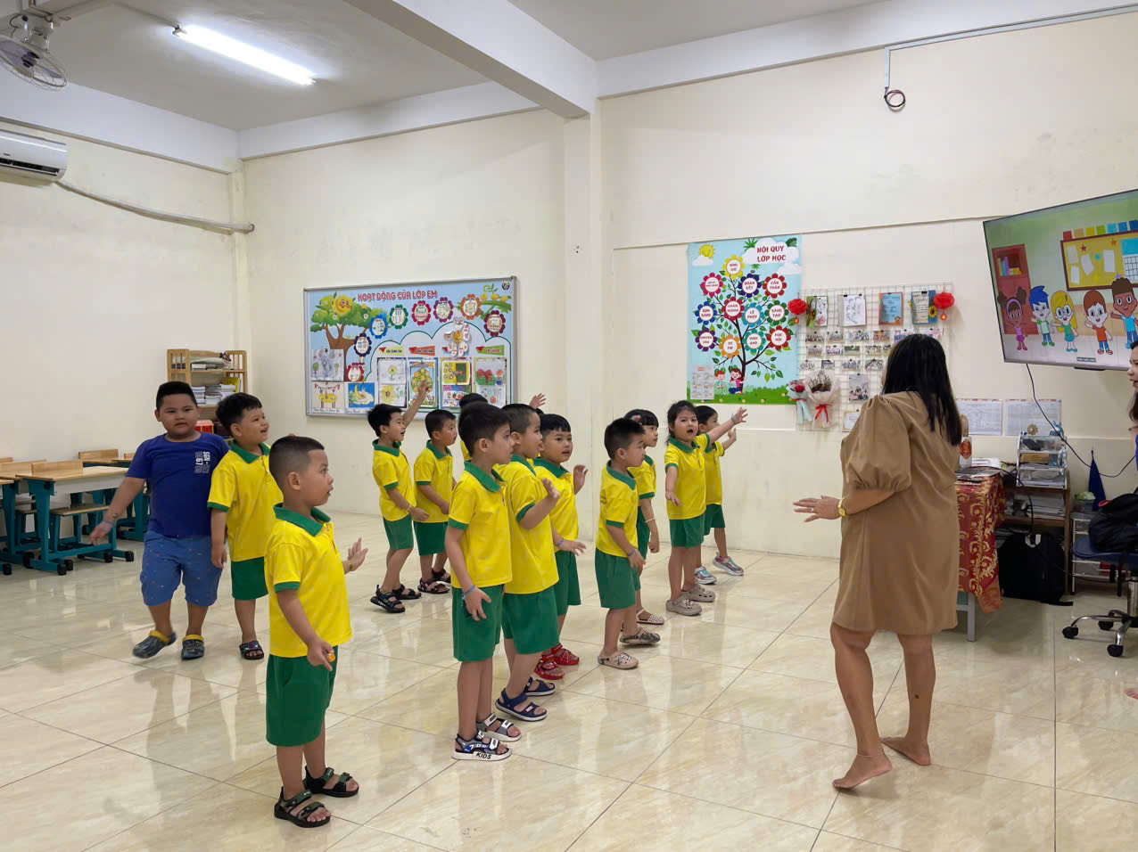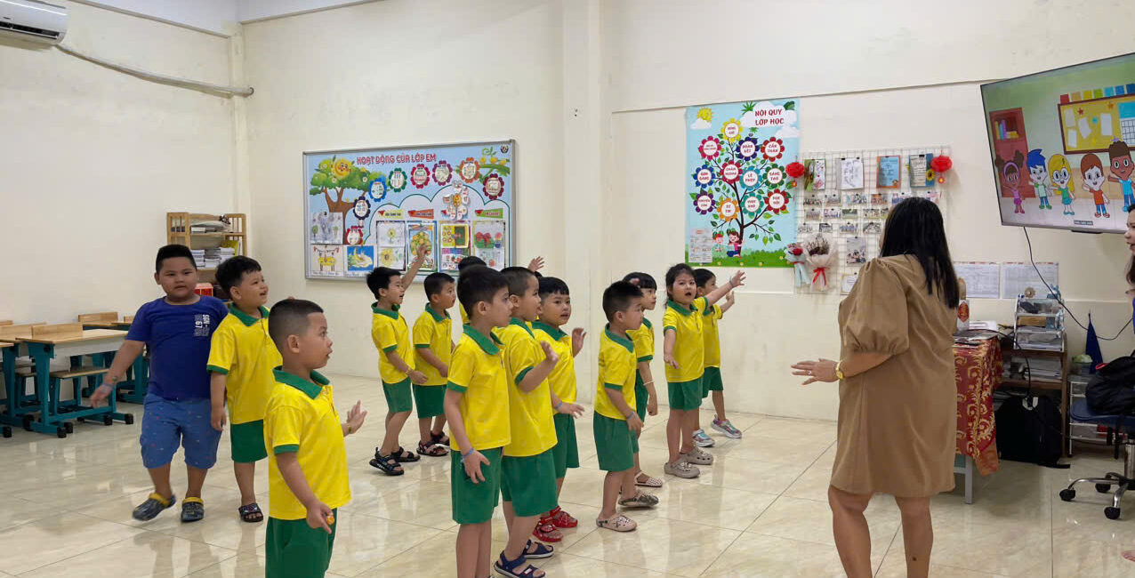 - Toàn bộ các nhóm, lớp trẻ đều được trang bị máy lạnh, ti vi màn hình lớn có kết nối internet